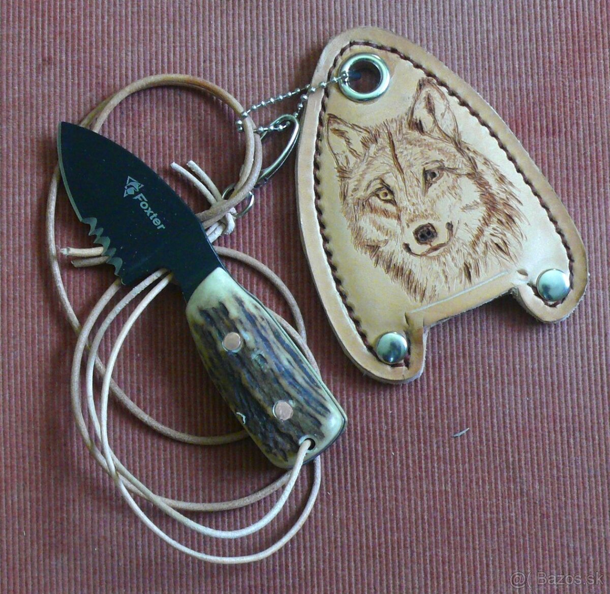 Mini nôž na krk. Nôž má extrémne ostrú nerezovú čepeľ typu full-tang, s čiastočným ozubením ostria. Rúčka je z pravého jelenieho parožia. Rúčka je vybavená koženým remienkom s karabínkou pre uchytenie noža k zápästiu, či k púzdru. K nožu patrí kydexové púzdro, ručne obšité - potiahnuté hovädzou kožou, ošetrené špeciálnym olejom proti poveternosti. Na prednej strane je ručnou pyrografickou technikou vypálený obrázok hlavy vlka. Púzdro má dlhý kožený remienok, pre zavesenie noža okolo krku, takže ho možno nosiť aj skryto pod oblečením. Dĺžka noža 13 cm. Dĺžka čepele cca 6 cm. Hmotnosť 80 gr. Nôž je nový, dosiaľ nepoužitý. Cena 29.- Eur + 6.- Eur poštovné/dobierka.
