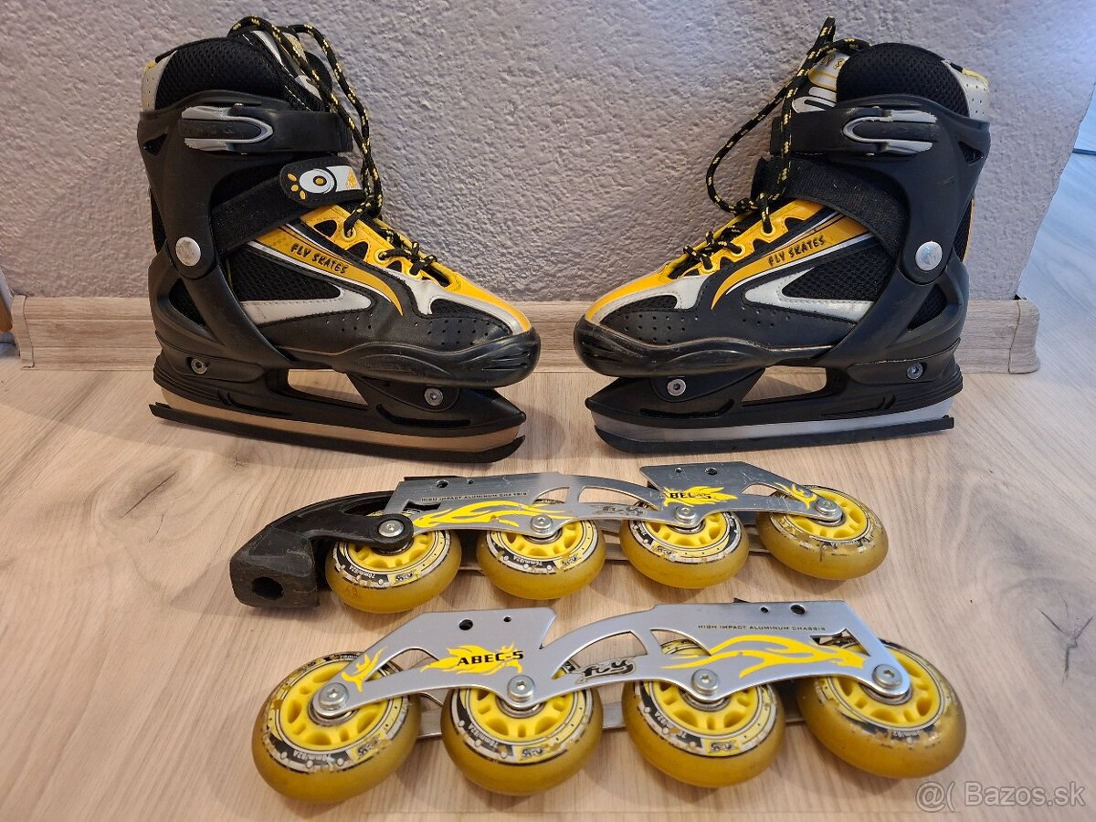 Predám detské univerzálne korčule 2v1, dajú sa použiť ako in-line aj na zimné korčuľovanie. Veľkosť 33, stav málo používané. Súčasťou sú podvozky na kolieska aj na ľad, všetko potrebné na výmenu je v balení. Skvelé na celoročné využitie – v zime na klzisko, v lete na chodník.