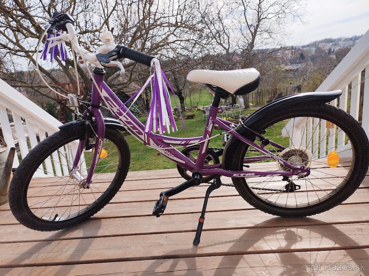 Predám detský bicykel CTM Maggie 20" v peknej bielo-fialovej farbe. Bicykel je jazdený, ale stále plne funkčný a pripravený na ďalšie používanie.