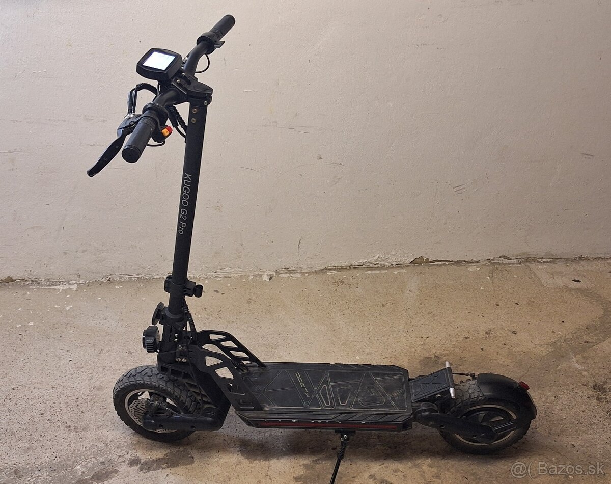 Predám používanú elektrickú kolobežku Kugoo G2 Pro. Je plne funkčná, spoľahlivá, odpružená. LED osvetlenie, digitálny displej, brzdové svetlo, stojan. Nosnosť 120 kg. Max. rýchlosť 45 km/h. 3 rýchlosti, Tempomat, Obmedzovač rýchlosti