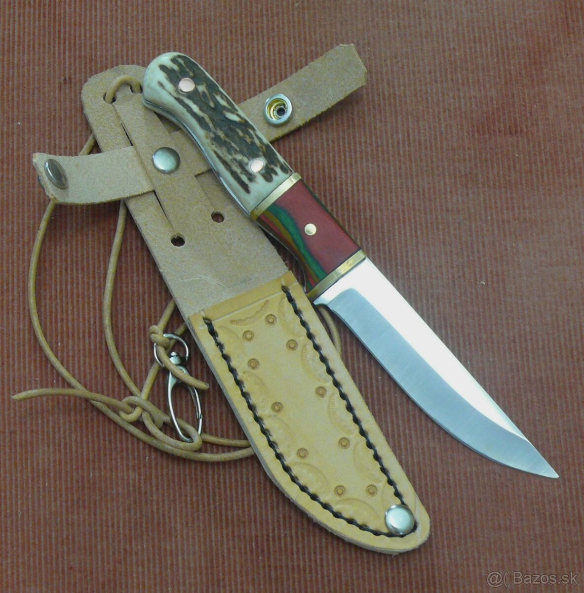Lovecký nôž midi veľkosti. Nôž má ostrú nerezovú čepeľ typu full-tang.Rúčka je kombinovaná z exotického dreva a pravého jelenieho parožia. K nožu patrí ručne šité kožené púzdro z kvalitnej kože - hladenice, ozdobené kvetinovou ručnou razbou a ošetrené špeciálnym olejom proti poveternosti. Púzdro možno nosiť na opasku, ale má aj dlhý kožený remienok s kovovou karabínkou, pre zavesenie noža okolo krku, takže ho možno nosiť skryto pod oblečením. Dĺžka noža 20 cm. Dĺžka čepele cca 10 cm. Hmotnosť 89 gr. Nôž je nový, dosiaľ nepoužitý. Cena 29,- Eur + 6,- Eur poštovné / dobierka.