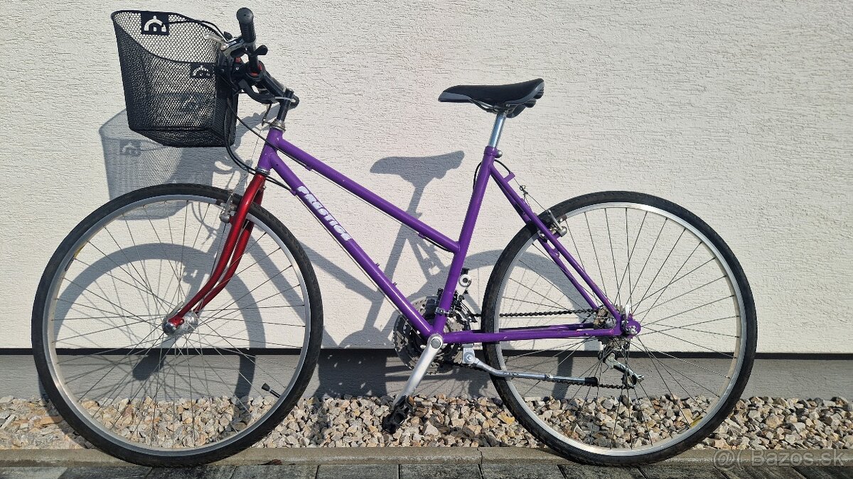 Predám starší krosový bicykel na foto. Je pojazdný - brzdy aj radenie fungujú. Radenie je 3x7 Shimano - páčkové. Priemer kolies je 28" , veľkosť rámu presne neviem ale odhadom na postavu 150-175 cm - samozrejme najlepšie je vyskúšať. Fialová farba je nastriekaná, pôvodne bol bordový ako vidlica. Má samozrejme škrabance a oderky ale je funkčný - nenáročnému poslúži na výlet, do obchodu alebo do roboty. Pneumatiky sú ok - nie sú zodraté ani defekt nemá. Nechám na ňom stojan a košík - prípadne pridám ešte nejaké drobné príslušenstvo. Cena 65€. Kontaktovať prosím na mail alebo telefonicky. Občas viem zabezpečiť odvoz na rôzny smer-KE, RV, RS, LC, DT, ZV, ZH, LV...treba sa opýtať.