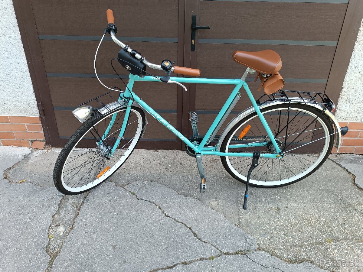 Predám tento bike vhodný ako štýlový retro comuter. Je to jedinečný bicykel vyskladaný na "historickom" ráme, aký nebude mať nikto iný...Okrem rámu, ráfikov a sedlovky všetky súčiastky nové. Predná bubnová brzda,vzadu Simano Nexus3, vpredu, vzadu nosiče... Obdobné sériové biky bez puncu originality stoja dnes 800-1000€.