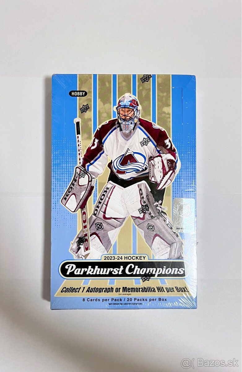 Nové, zabalené. Mierne poškodená fólia na boxe (foto). 2023/2024 Upper Deck Parkhurst Champions Hockey. Hobby Box obsahuje 20 balíčkov (každý po 8 kartičkách).