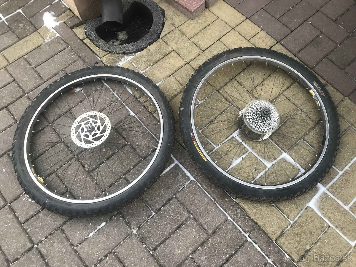 Predám 26'' kolesá, rafiky Mavic, plášte WTB Moto Raptor 2.1 26x49/52, náboje Ovation, po dohode možno aj s kotúčmi Shimano SM-RT8 160mm, a zadnou kazetou 9 speed. V prípade záujmu mám aj bzrdy Shimano Deore, kluky aj prehadzovačku Shimano Deore. Cena za kolesa 80€.