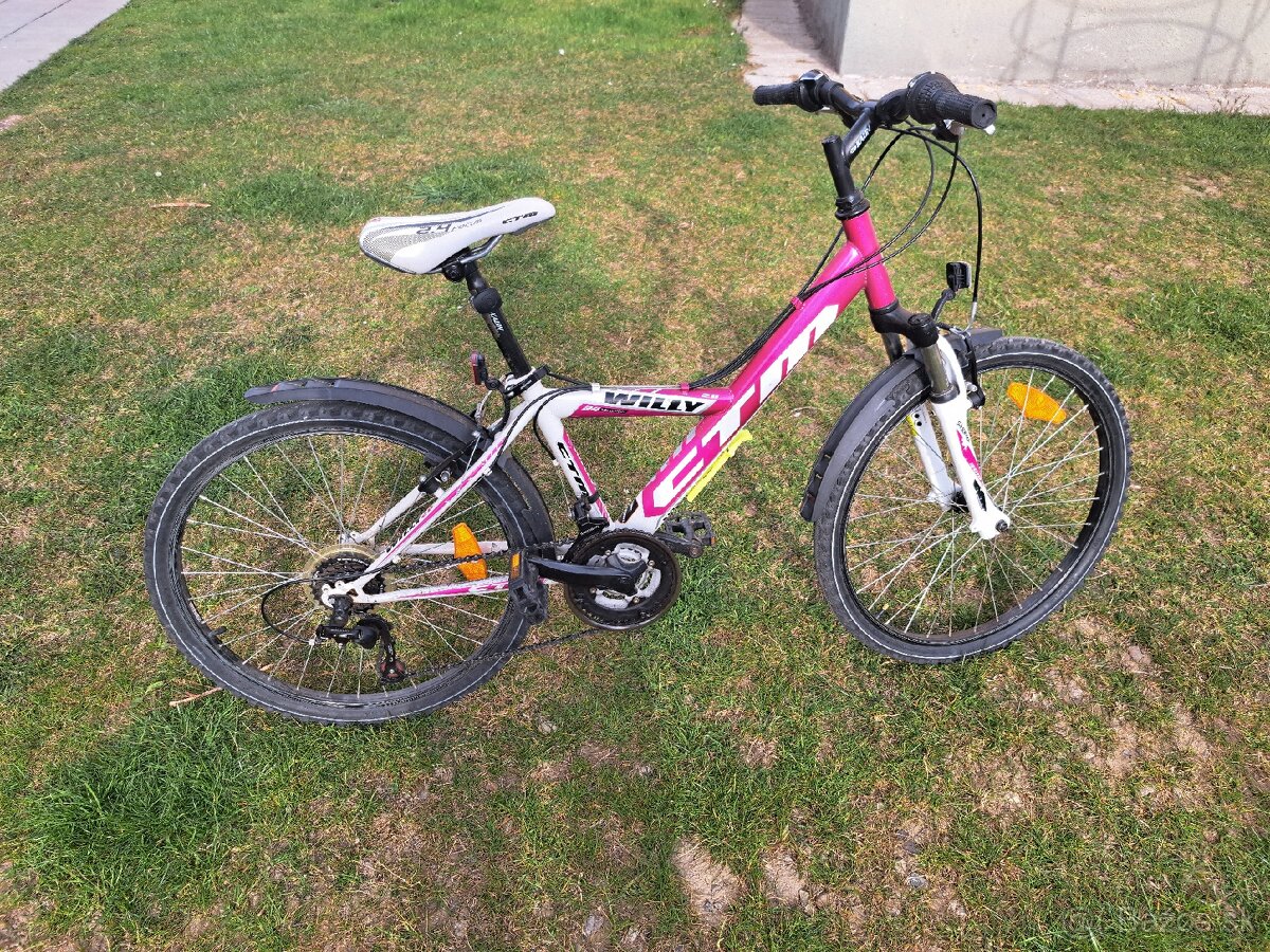 Predám dievčenský bicykel CTM-Willy 24"kids collection,odpruzena predná vidlica,prehadzovacky Shimano,18 prevodov,servisovany,menené lanka aj boldeny.